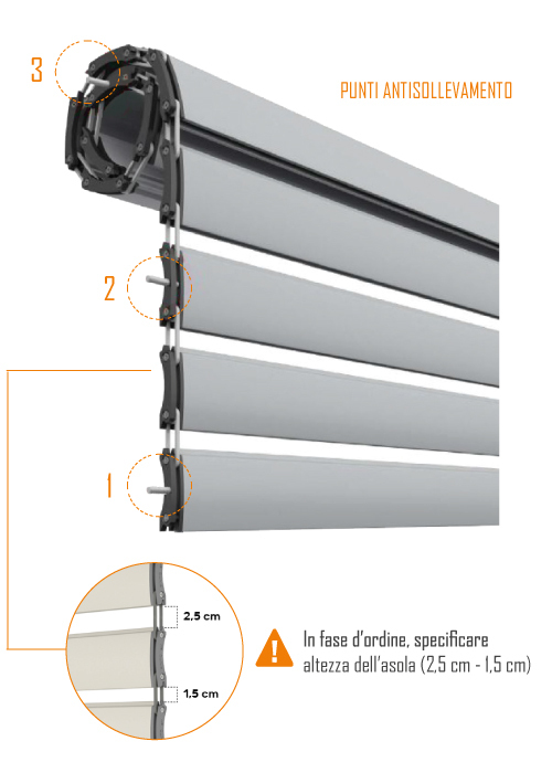 Grazie allo spazio tra le lamelle, disponibile in due varianti da scegliere al momento dell’ordine (2,5 cm o 1,5 cm), questa tipologia di avvolgibile permette una personalizzazione della luce adatta alle più diverse esigenze abitative e una significativa areazione dell’ambiente, garantendo una minore formazione di muffe o altri